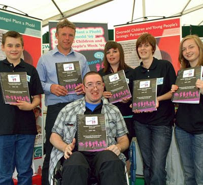 Photograph: Gwynedd Children and Young People’s Partnership Chair, Iwan Trefor Jones with young people from the opinions group Clebran, during the official launch of the Gwynedd Children and Young People’s Week at the 2009 National Eisteddfod at Y Bala