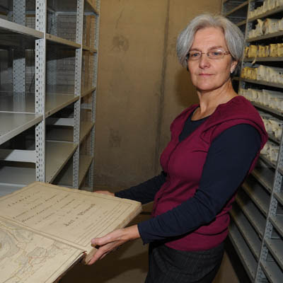 Photograph: Glamorgan County Archivist Susan Edwards with a 1766 survey of land owned by the Earl of Plymouth in Llanishen, Lisvane and Rudry